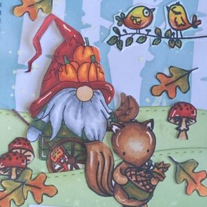 - Stamps: We will use the “Autumn Wheelbarrow Halloween Gnome” digital stamp and the beautiful ‘Nuts about you’ clear stamp set from Polkadoodles to create our charming gnome and his squirrel friend.
