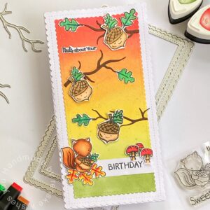 - For the squirrel, leaves, and acorns from the clear stamp set, use black ink that’s alcohol-marker friendly to stamp them onto DCP paper. This ensures that your ink won’t smudge when you start colouring.