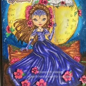 I coloured the moon in warm shades of yellow and gold, creating a soft, radiant glow. On the spots on the moon, I applied white with a white gel pen. I coloured the woman’s dress purple shades. To also add some colour that stands out, I chose bright pink flowers on her dress, umbrella and around the moon.