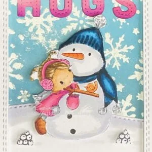 - Snowman hug: This is the stamp that I have used for my card. It is a cute image of a snowman getting a hug from a girl. It is a very cosy and snuggly stamp that can be used for any occasion. You can find it here or click on the link below the image.