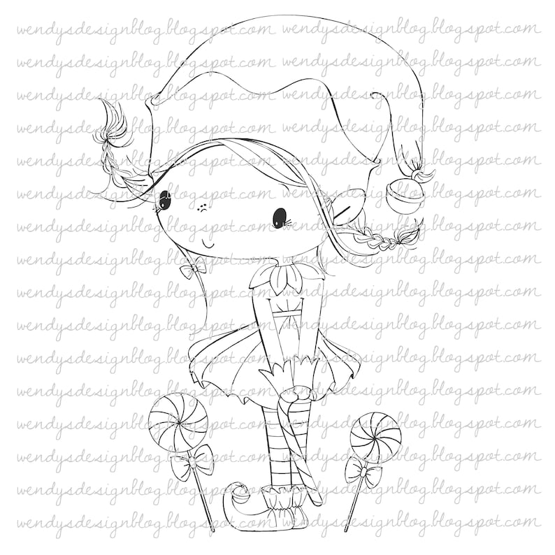 - Little Elf: This is a stamp of a little elf holding candy and being surrounded by candy. It is a very festive and cheerful stamp that can be used for Christmas cards or tags. You can find it here or click on the link below the image.