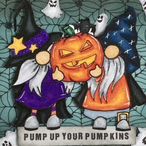 For this challenge, I chose to work with the beautiful digital stamp ‘Pumpkins Halloween Gnome’. In this article, I will take you on a creative journey as we create the unique Halloween gnome card together.