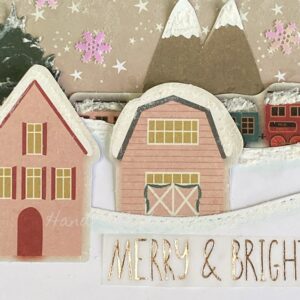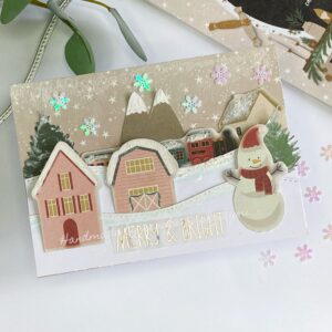 - Now you can attach the hill to the front. The house with the pointed roof comes on the far left and the snowman is on the far right. You can place the vellum sentiment “Merry & Bright” in the space between the snowman and the house.