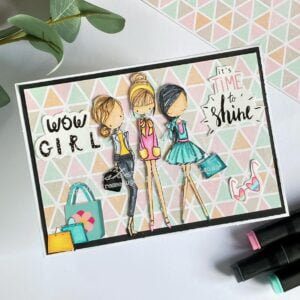I have decided to cut out all three ladies so that I have the freedom of where I want to place them. I wanted them to be in the centre of the card as much as possible. To create some dimension on the card, I used foam tape to make them stand out a little more. If you don’t have foam tape, you can also create this effect by sticking pieces of paper together and attaching them behind the pictures.