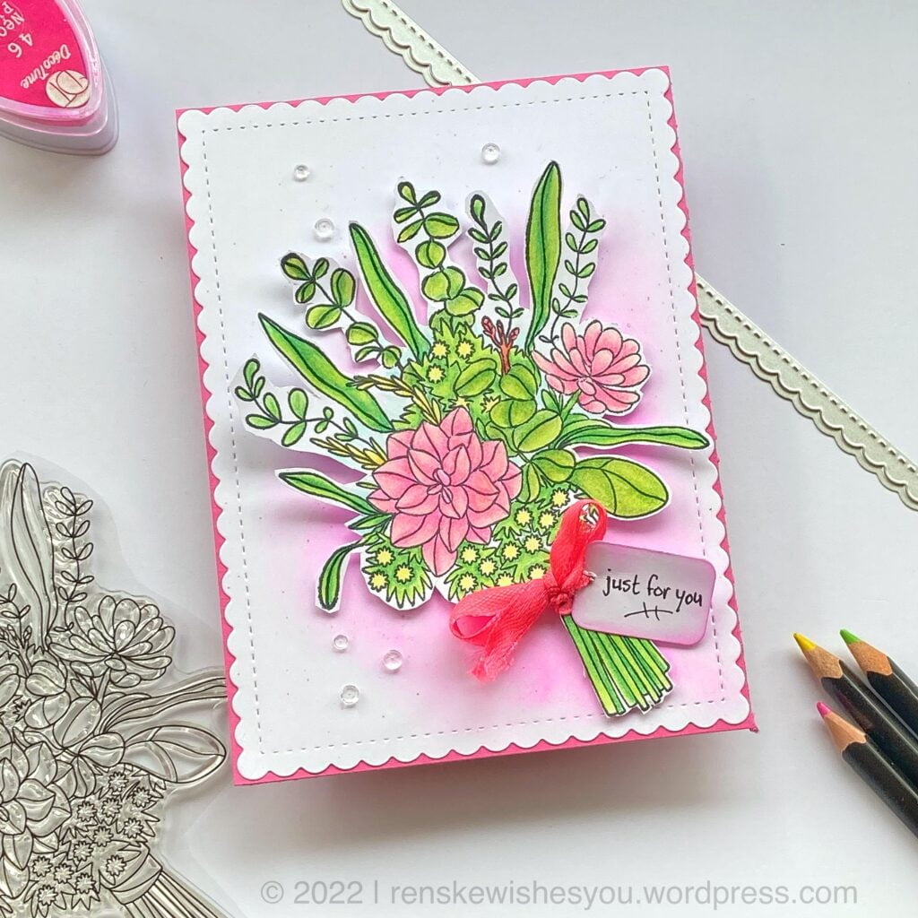 On the die-cut background, I apply some pink ink to get behind the flowers. I place a ribbon around the stems of the flower with a tag attached with the text ‘just for you”. Just a few little transparent stones on top and the card is finished.