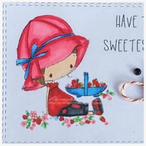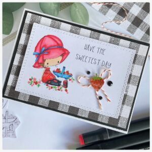 Today, I would like to share with you the story behind my latest card creation – a beautiful handmade greeting card featuring a charming girl in a sun hat surrounded by juicy strawberries. I made this strawberry card for the new challenge in the All Dressed Up Stamps Facebook group. The theme for this month’s challenge is “Things you love” and I couldn’t think of a better way to show with this card that I love strawberries so I chose the cute digital stamp “Strawberry Patch”.