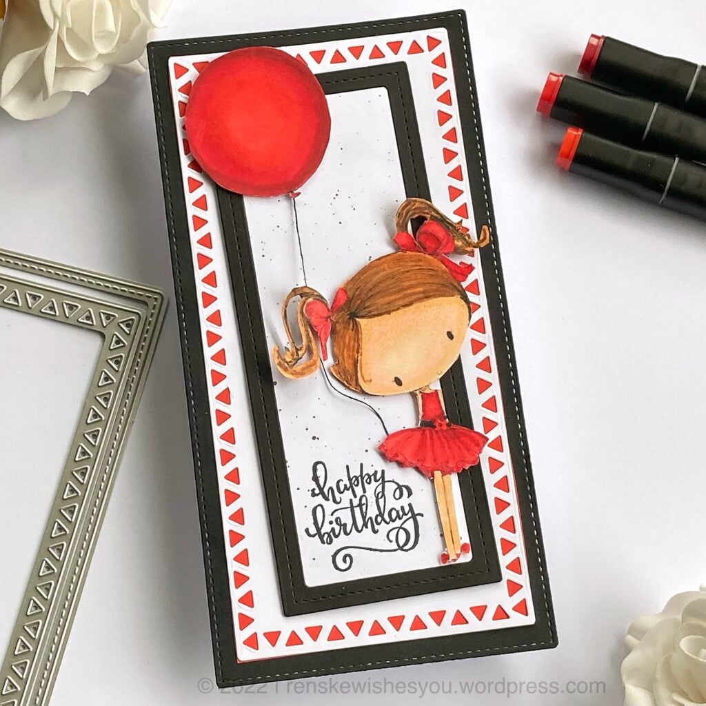 It’s time again for a new challenge on the Penny’s Paper-Crafty challenge blog. The theme is always anything goes. For this new challenge, I created a Happy Birthday slimline card featuring a cake and balloons.