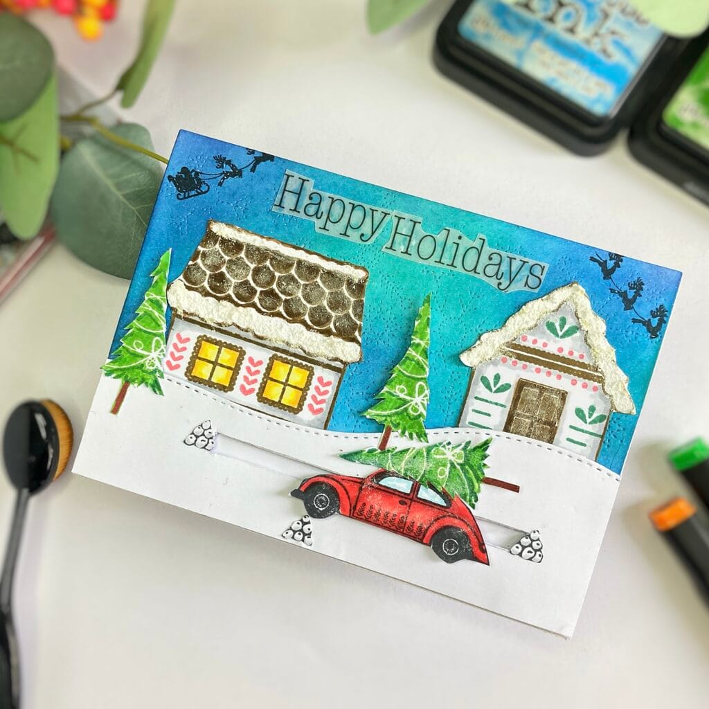 Now that you’ve stamped and coloured the main images, it’s time to bring your scene to life. Next, we’ll create the background for our interactive Christmas card. This background will not only enhance the colours and details but also give your card that fun, interactive dimension.