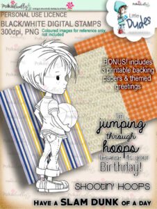 Let’s start with these Polkadoodles products and discover how to make fun masculine cards together. Let’s unleash our creativity and create something extraordinary – the adventure begins now! Little Dudes Digi stamp to make a DIY basketball card.