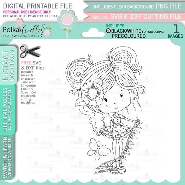 I printed the digital stamp several times. To make the card more interesting, I want to make the image in 3D. I cut out the different parts. In this case, they are the hair and flower, the dress, the banner and the butterfly.