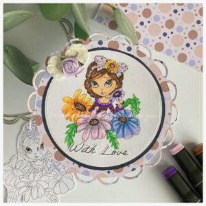 I still had a digital stamp from our sponsor, Colour of Love, laying around. I got to work with their charming Daisy Delight – Daisy Love digital stamp. The adorable digital stamp features a semi-illustrated girl with three large flowers and leaves in front of her. Her striped dress, adorned with a polka dot bow with a central flower, complements the theme perfectly. I picked colours for the digital stamp to match the patterned paper I used. I’ll share with you the colour combinations I used to bring this design to life with my trusty Twin Markers: